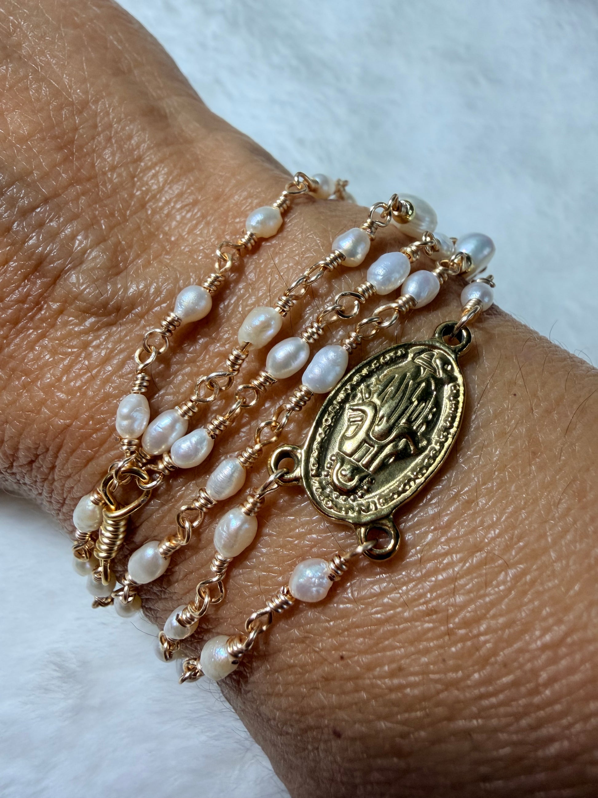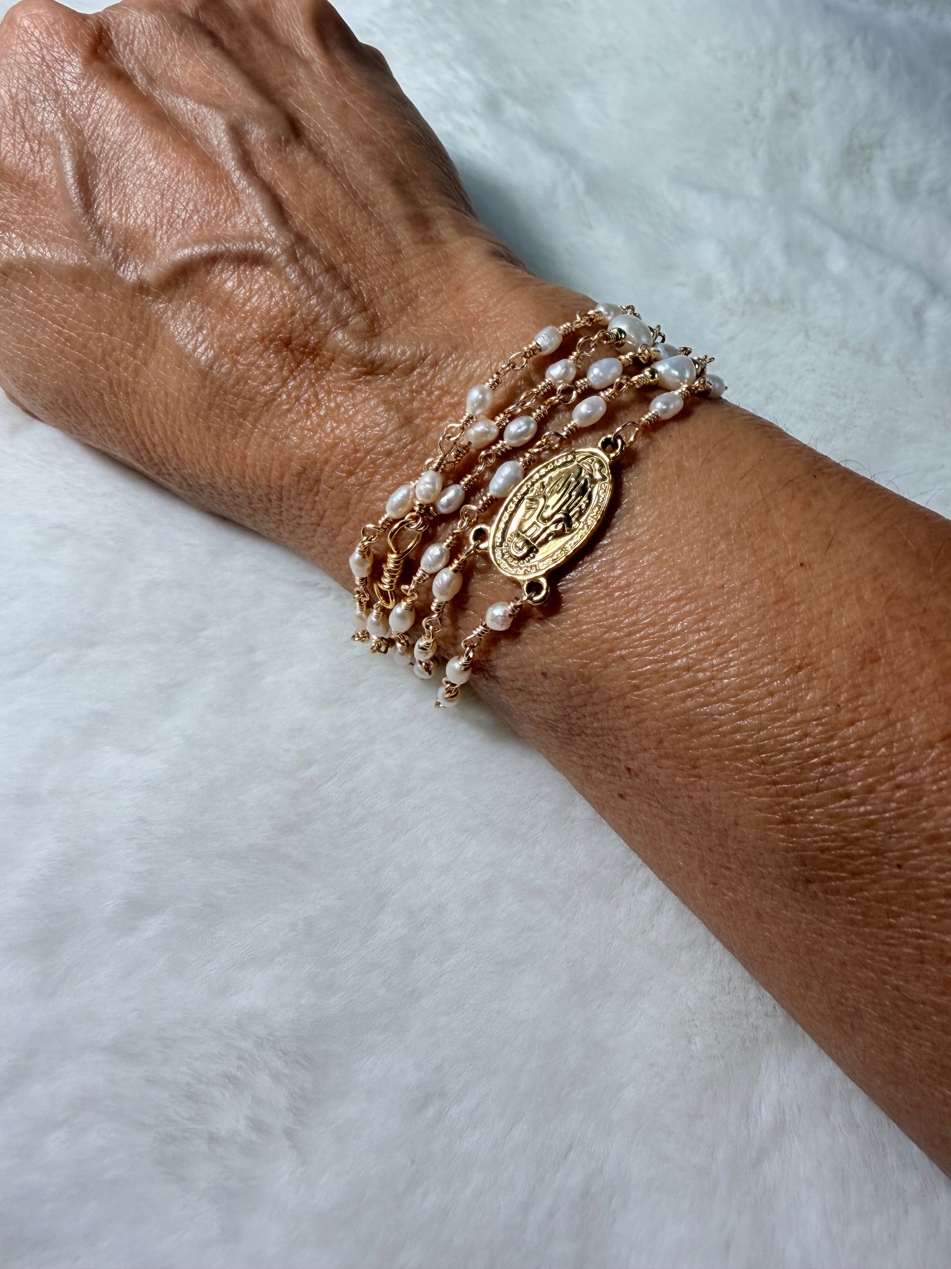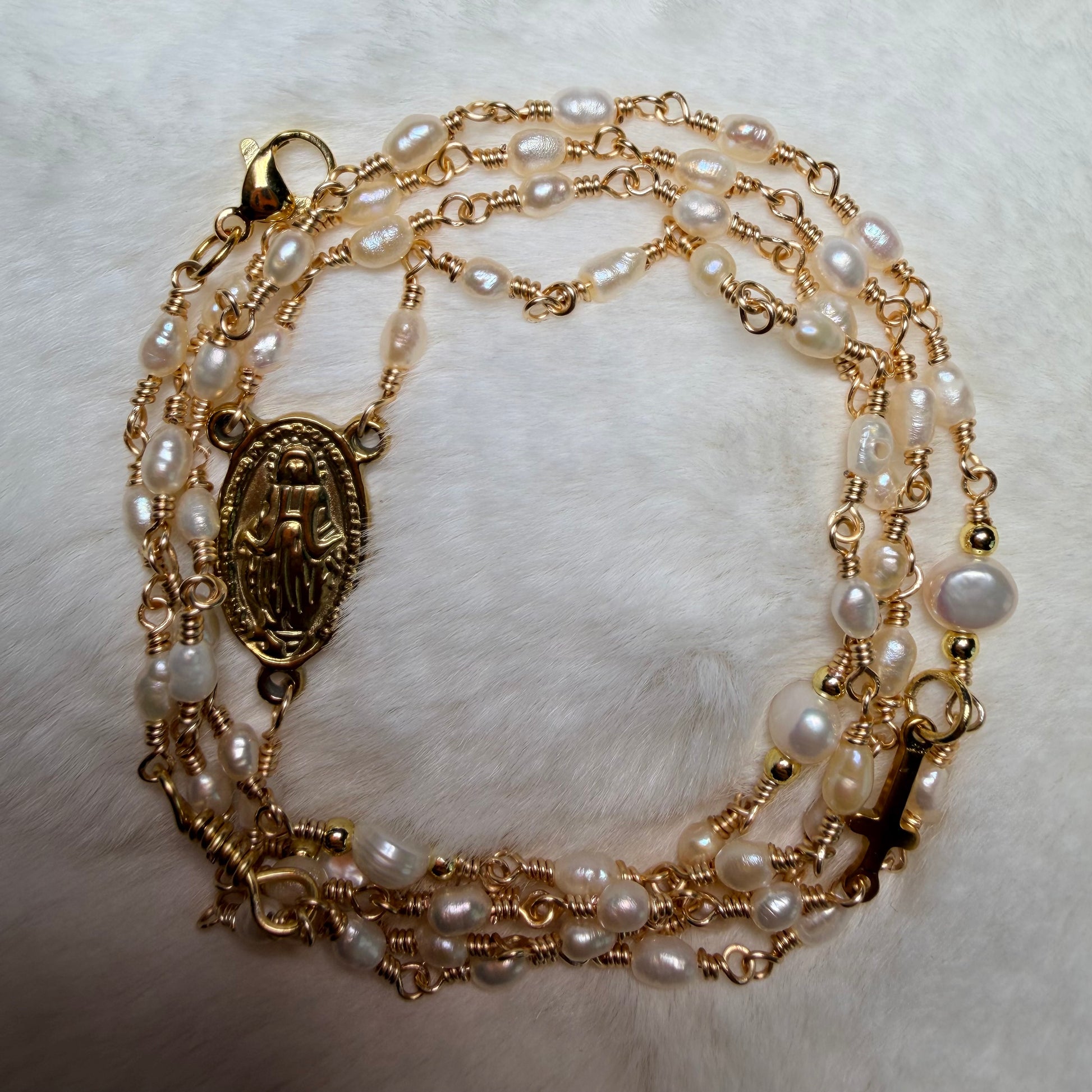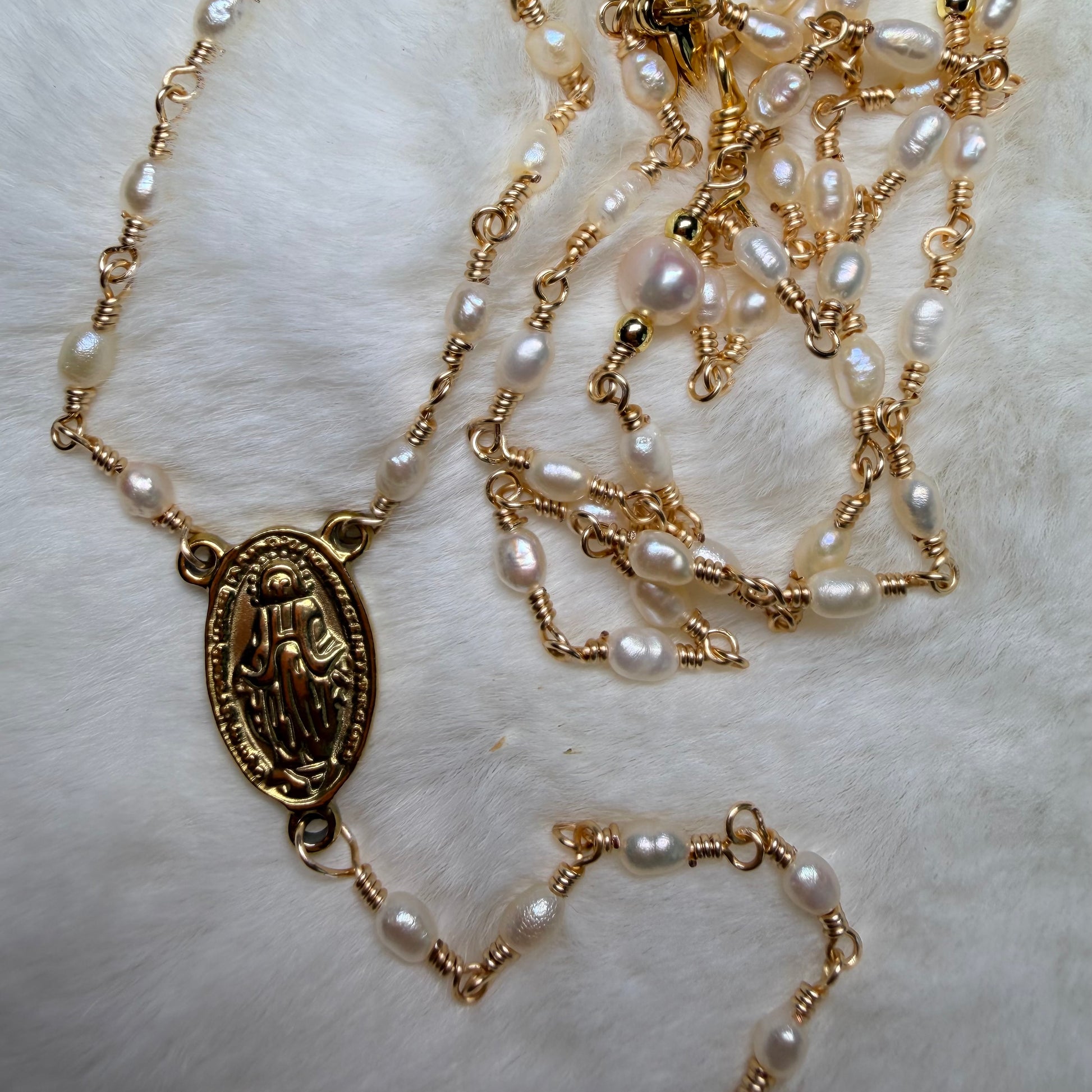 Rosario Perla Luz de María elaborado con perlitas de 3 mm engarzadas en alambre resistente,