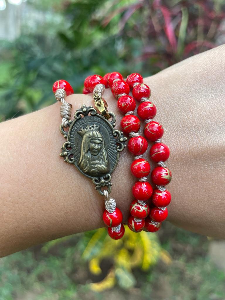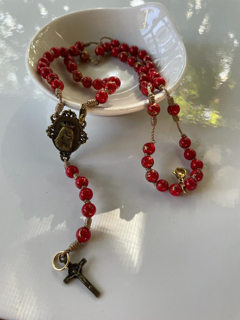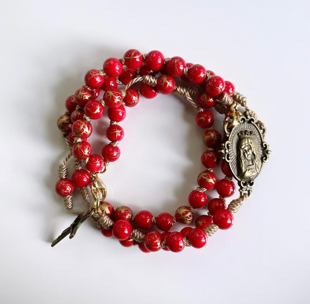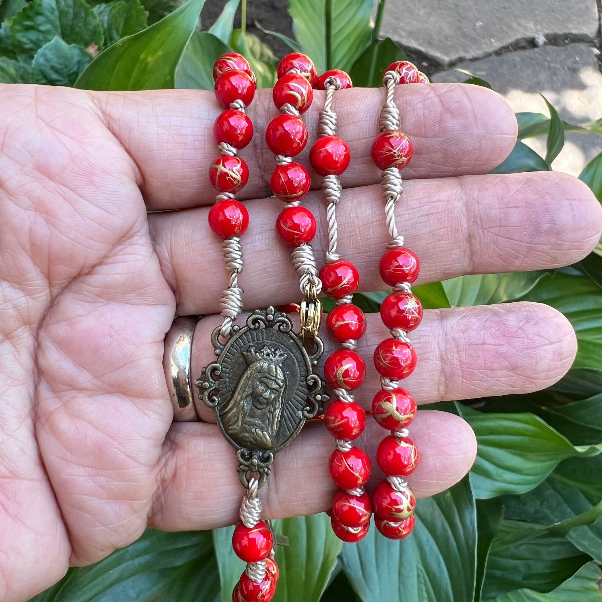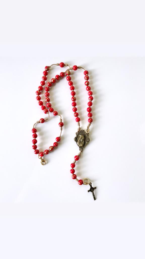 Rosary knotted in the Franciscan style. Made with 6mm red beads with gold highlights and copper-colored accessories.