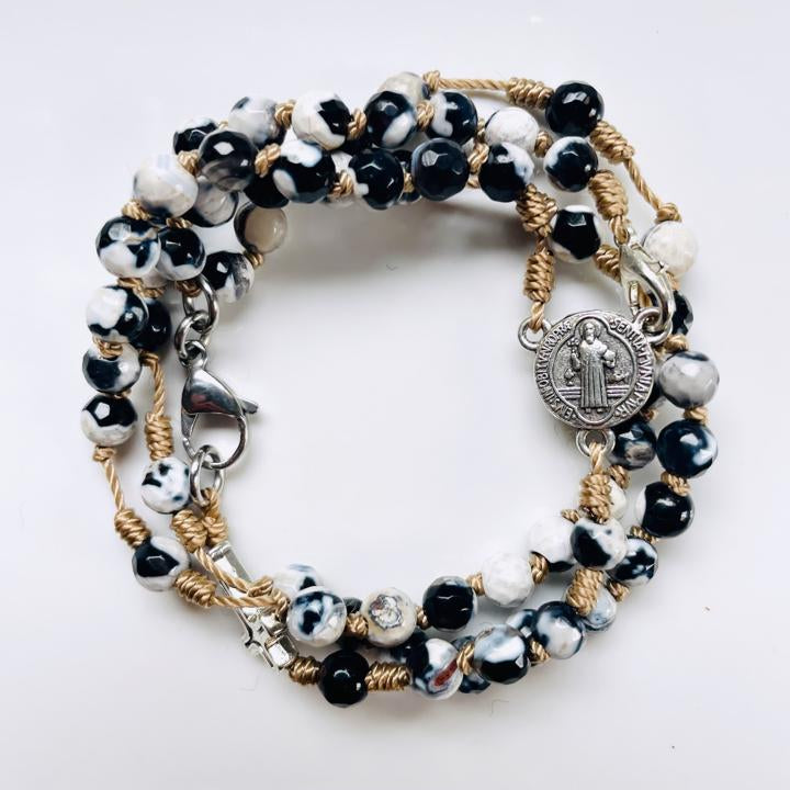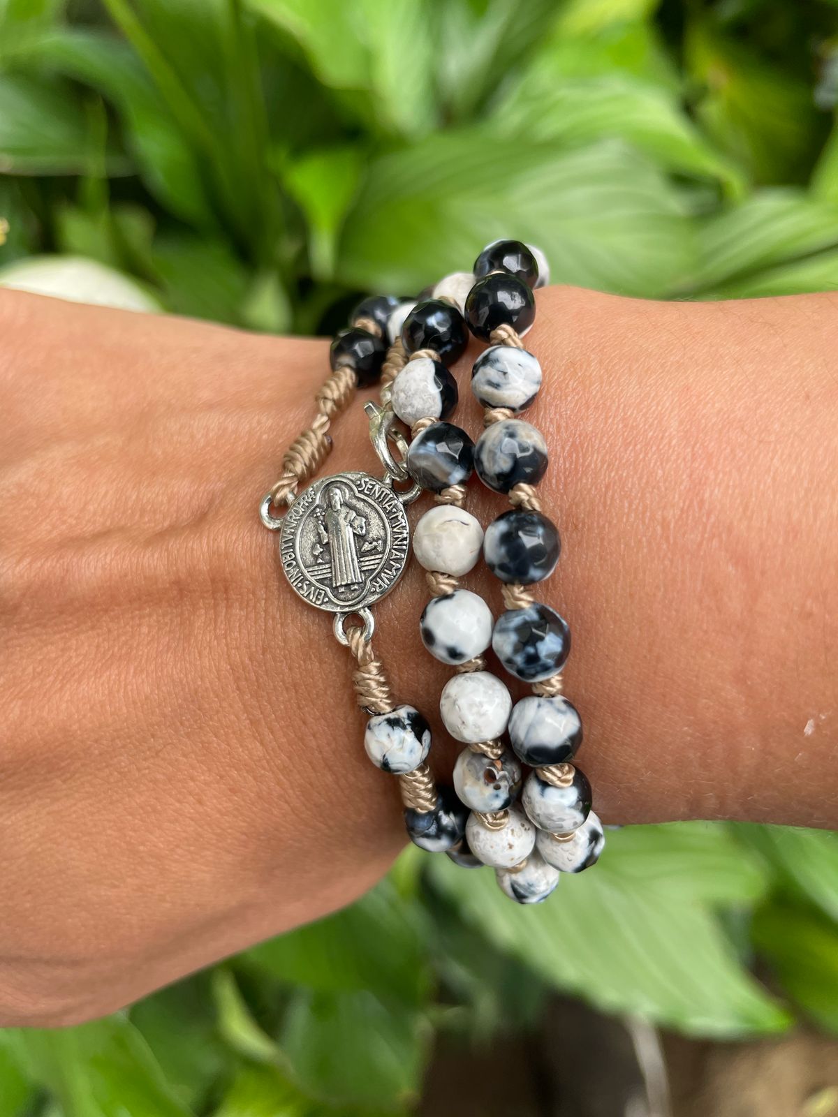 Un rosario que cuenta tu historia. Este rosario, hecho con piedras naturales de Ágata de 6mm y accesorios plateado piuter, te ofrece una conexión única con tu fe. Puedes llevarlo como pulsera, collar o camándula.