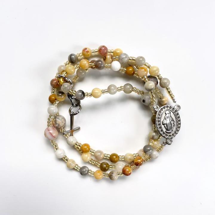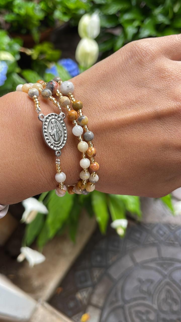 Conéctate con la fortaleza de la tierra en tu camino de fe. Esta pulsera rosario ha sido elaborada con cuentas de ágata beige de 3 mm, una piedra que simboliza la estabilidad y la tranquilidad. Engarzada en un resistente hilo de alta calidad, esta pieza combina la sencillez con la durabilidad.