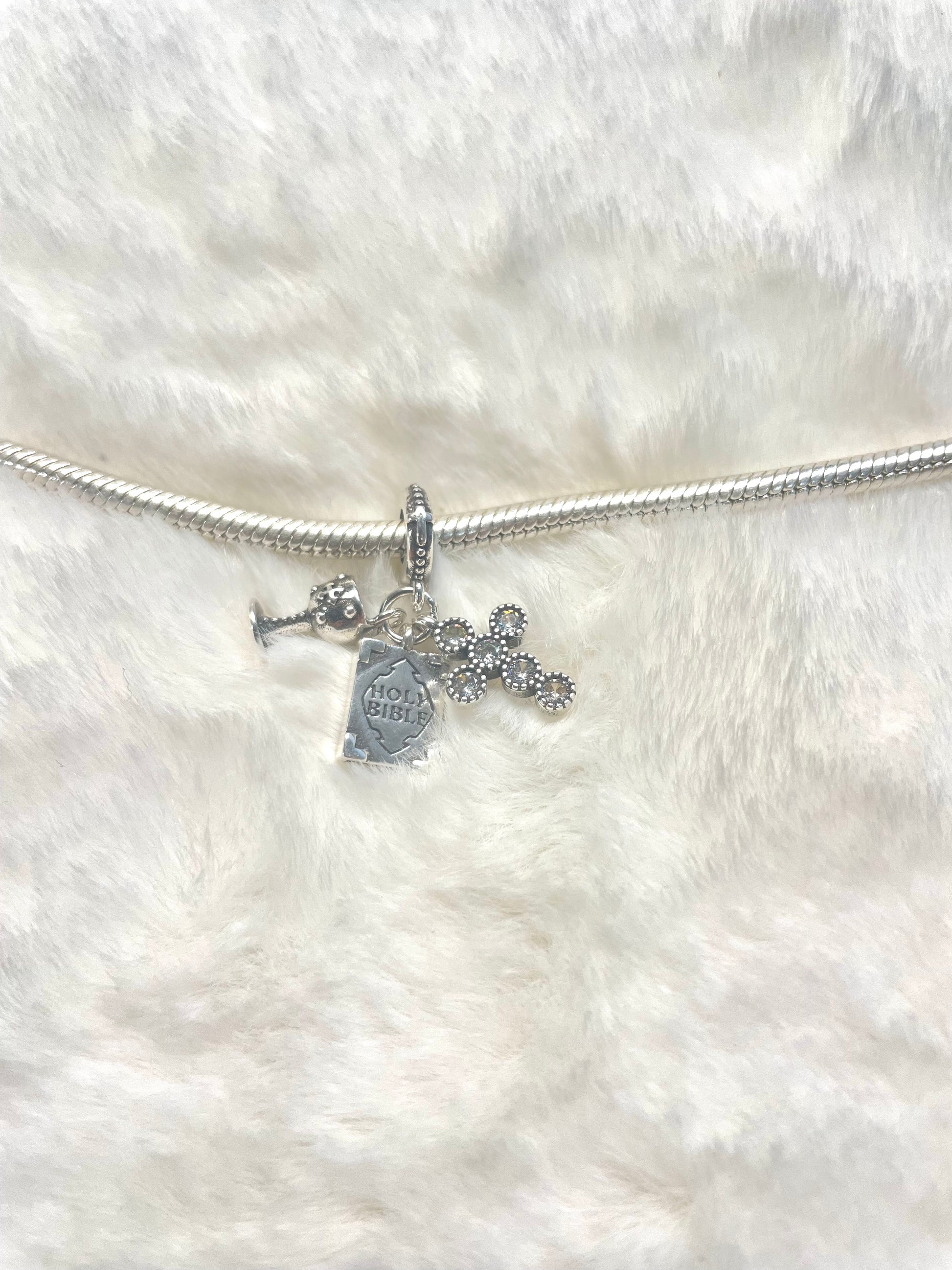 Lleva tu fe y protección siempre contigo. Este exquisito charm colgante de Plata 925 es una joya única con tres dijes en uno. Cada pieza está llena de significado: una Biblia que representa la sabiduría y la palabra de Dios, una Cruz que simboliza la redención y la esperanza, y la copa eucaristica. Es el accesorio perfecto para personalizar tu pulsera tipo Pandora y tener un recordatorio de los pilares de tu fe en cada momento.