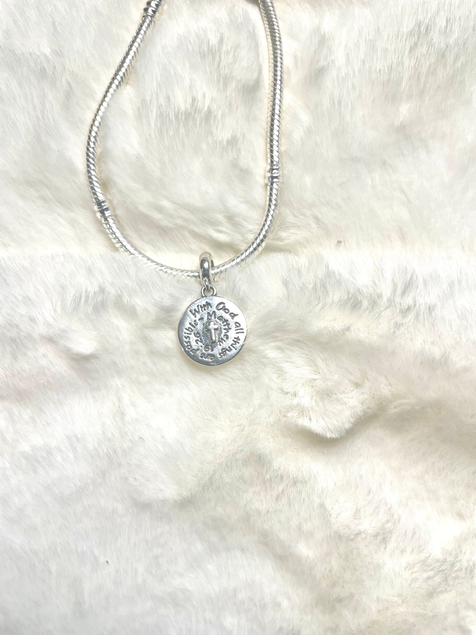 Con Dios todo es posible. Este delicado charm colgante de Plata 925 lleva grabado el poderoso texto de San Mateo 19:26, un mensaje de esperanza que te recordará el poder ilimitado de la fe. Su diseño circular es el complemento ideal para personalizar tu pulsera tipo Pandora y llevar un recordatorio de que con fe, no hay límites.