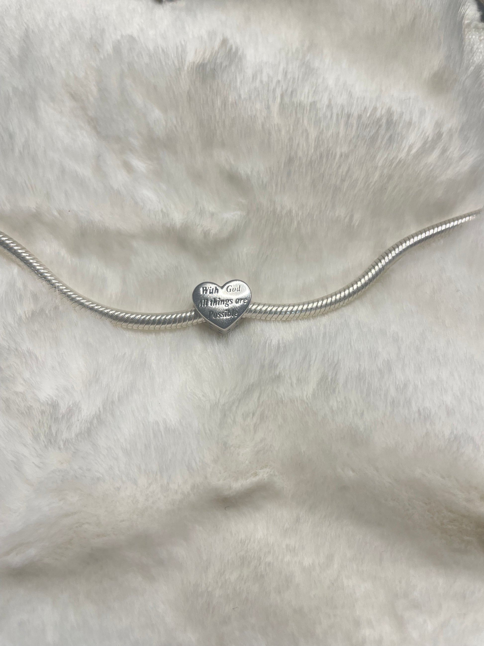 Un recordatorio de fe. Este exquisito charm de Plata 925 en forma de corazón lleva grabada la inspiradora frase "Con Dios todo es posible". En su reverso, una elegante cruz dorada simboliza la esperanza y la divinidad. Es el accesorio perfecto para tu pulsera tipo Pandora, combinando elegancia, devoción y un mensaje que te llenará de fuerza.