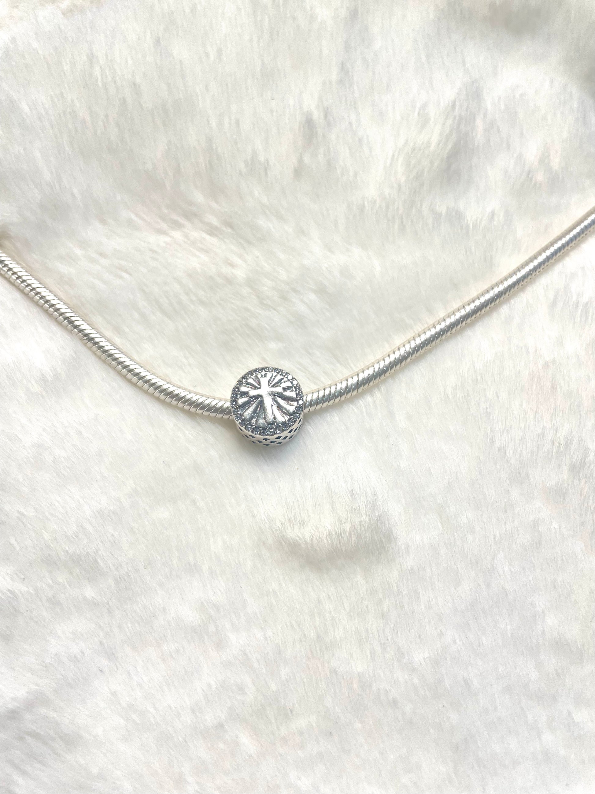Con Dios todo es posible. Este delicado charm de Plata 925 lleva grabado el poderoso texto de San Mateo 19:26, un mensaje de esperanza que te recordará el poder ilimitado de la fe. Su diseño circular es el complemento ideal para personalizar tu pulsera tipo Pandora y llevar un recordatorio de que con fe, no hay límites.