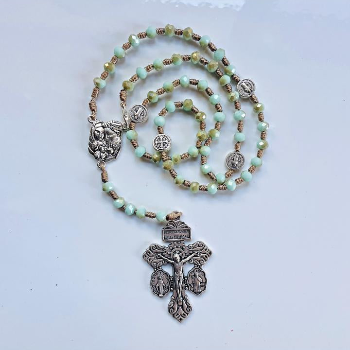 Esta camándula de cristales checos de 6mm es un accesorio para la devoción y la reflexión. Cada pieza, unida con un resistente nudo Franciscano, presenta la Cruz del Perdón, un poderoso símbolo de gracia y reconciliación. Su diseño versátil te permite usarla como collar y, lo más importante, como tu compañero de oración.
