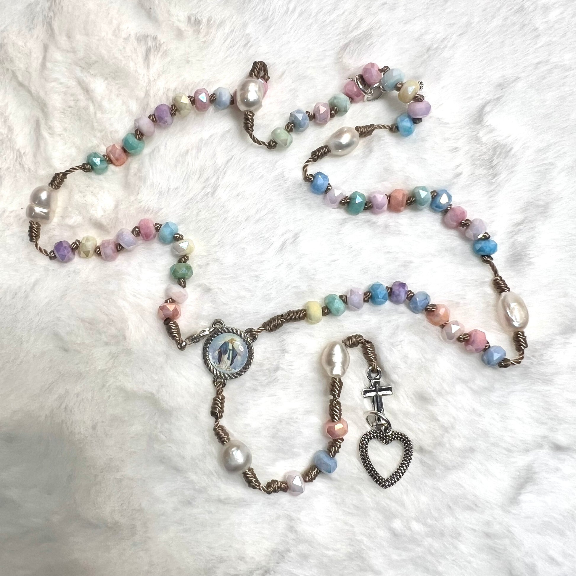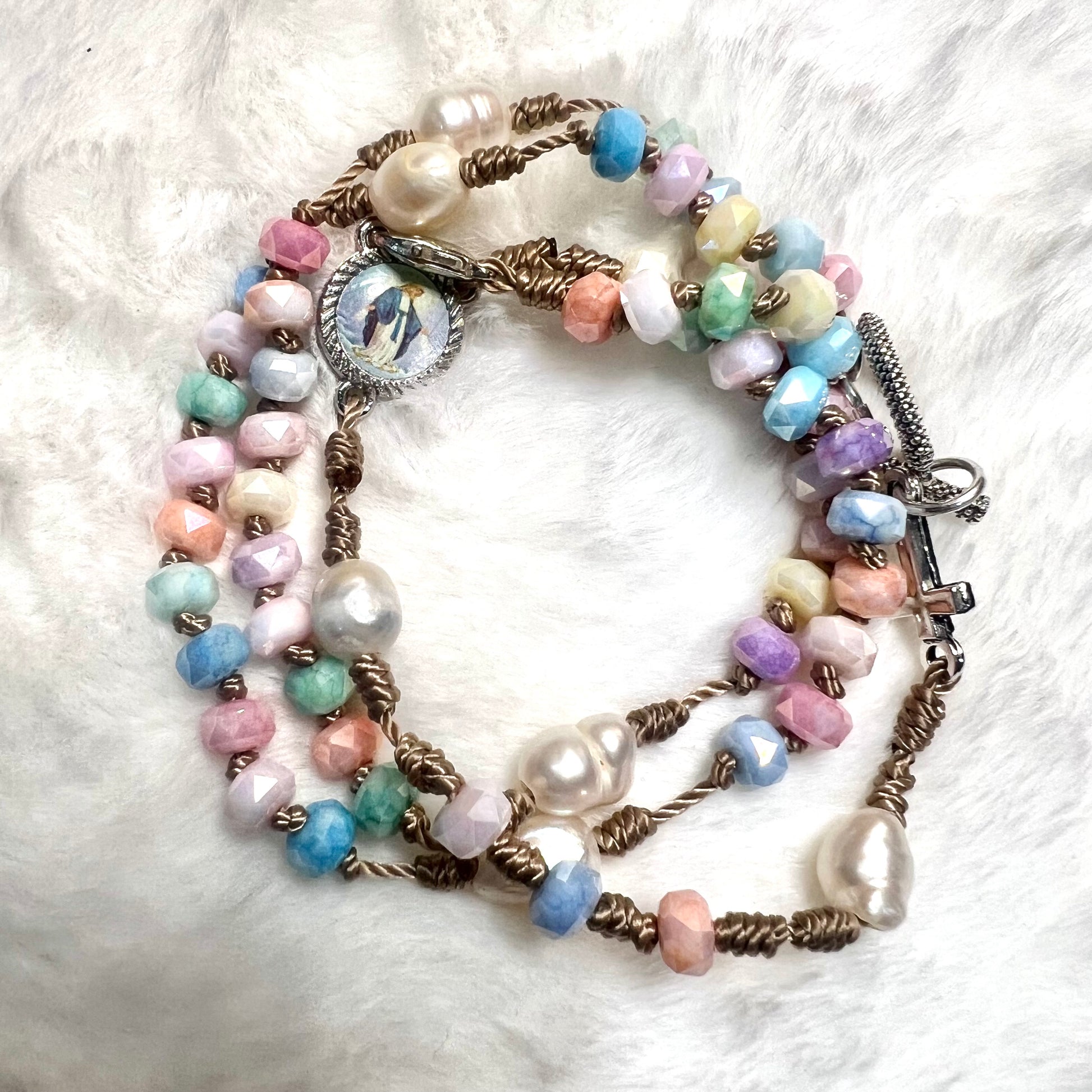 Un rosario tan especial como un jardín de fe. Este accesorio, hecho con piedras de colores de 6 mm , en los Padres nuestros está una perla escogida con cuidado que irradia belleza, frescura y alegría. Cada pieza es una obra de arte, cuidadosamente engarzada en un cordel con nudos franciscanos para un acabado tradicional y lleno de significado.