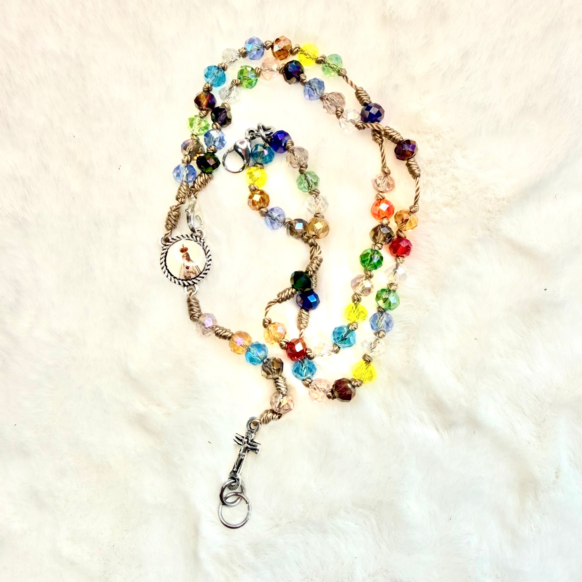 rea tu propia pieza de fe con un toque de luz. Este rosario, elaborado con auténtico cristal checo de 6 mm transparente y multicolor TORNASOL, captura la luz y el color en cada cuenta. Las perlas están finamente engarzadas en un cordel con los clásicos nudos franciscanos, uniendo la tradición con una belleza moderna.