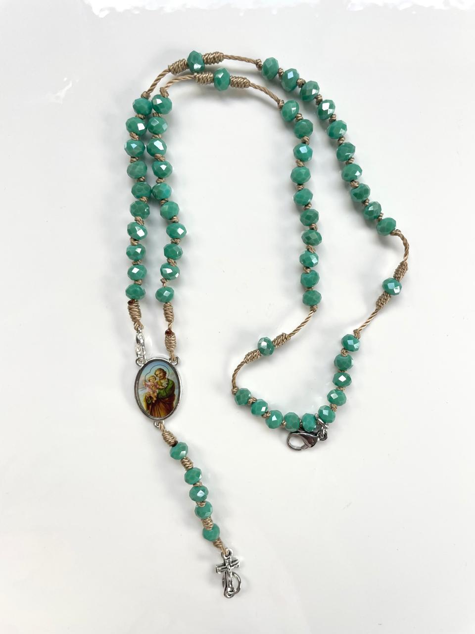 Deja que la pureza del cielo y el agua te guíen en tu oración. Este rosario está hecho con cristales checos de 6 mm en un cautivador tono aqua, engarzados a mano con el tradicional nudo franciscano. Los accesorios plateados de pewter complementan su diseño, creando una pieza de belleza serena y gran valor espiritual.