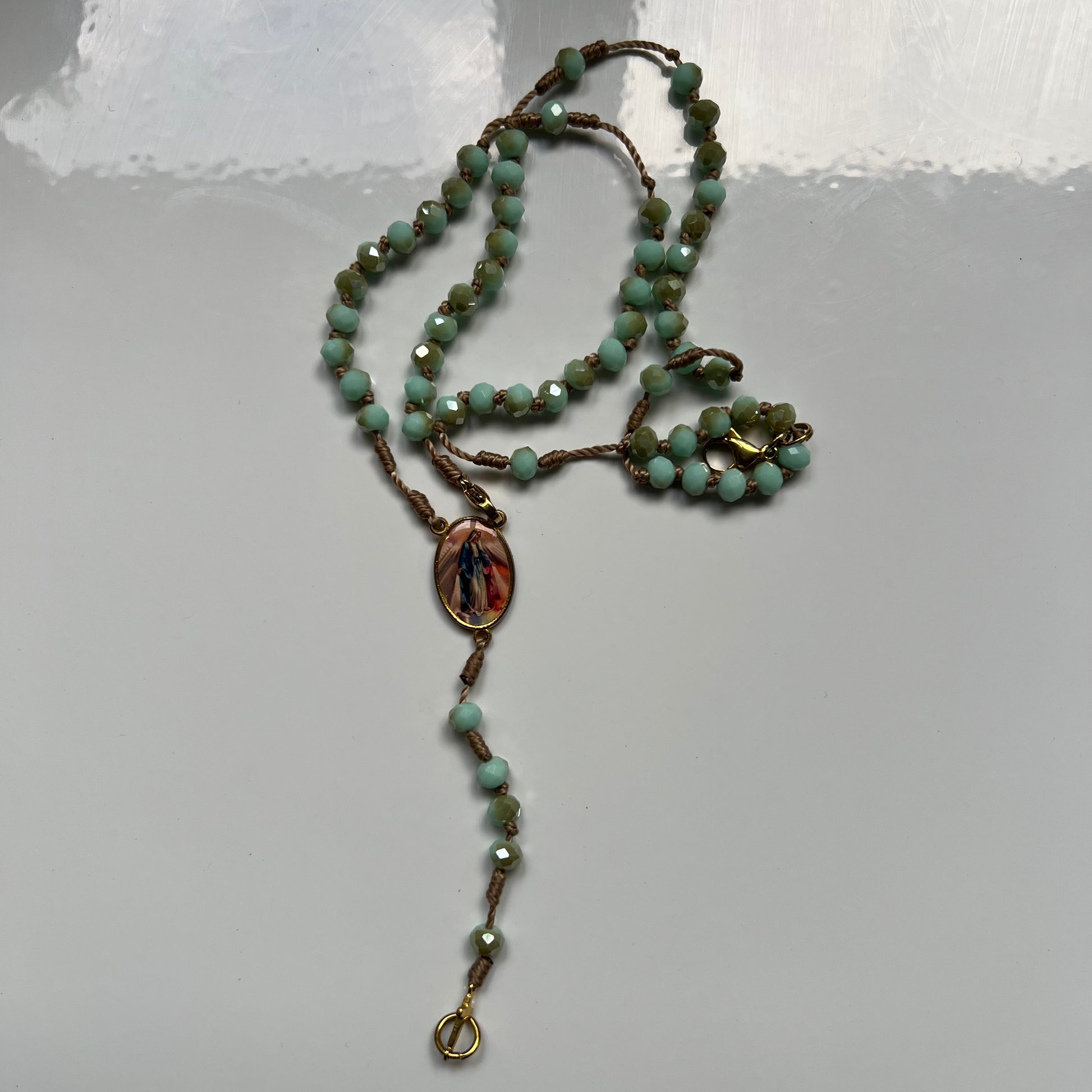 Cristal Cheko verde Aqua de 6mm, engarzado en cordel con nudos Franciscanos. Accesorios plateados de piuter. Se puede usar como collar, pulsera, porta mascarilla y lo mas importante para rezar.