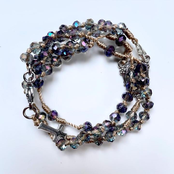 Ilumina tu oración con el brillo de la gracia. Este rosario está elaborado con cristales checos de 6mm que destellan con un efecto tornasol, capturando la luz y transformándola en un arcoíris de colores celestiales. Engarzado con el nudo franciscano, cada cuenta te recordará la belleza de la creación y el amor incondicional de la Virgen María.