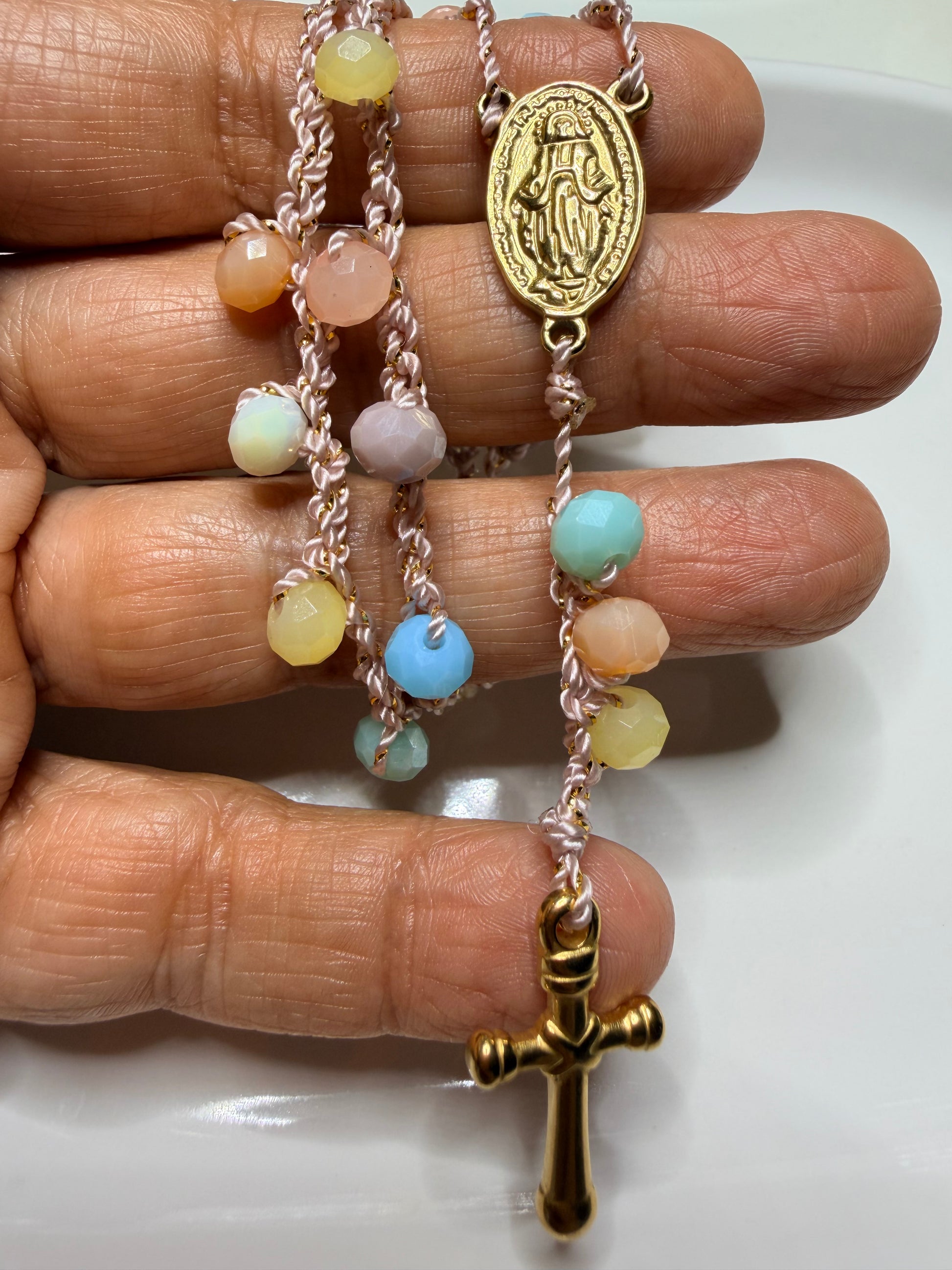 Un rosario tan tierno como una oración. Hecho con cuentas de Cristal cheko de 6mm (2misterios, uno a cada lado) engarzado totalmente a mano en puntada de crochet en un delicado hilo tono crema y destellos dorados , esta pieza es un símbolo de amor, sus accesorios y medallas en acero dorado, si lo quieres en plateada , solo déjanos saberlo.
