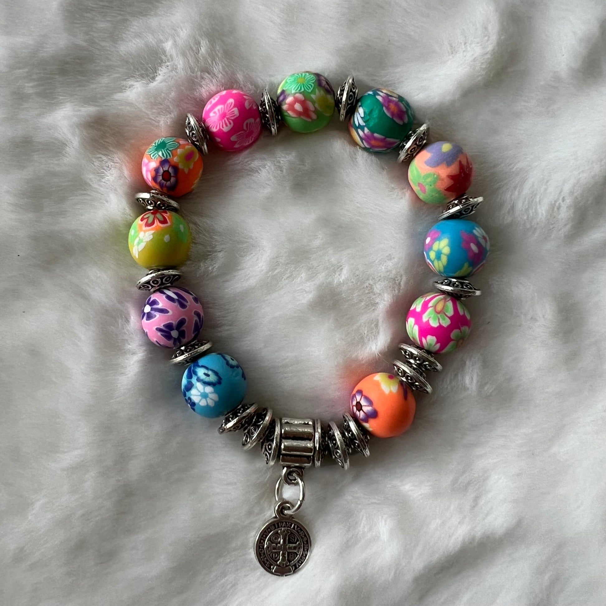 Decenario engarzada en elastico , pelotas de colores de 10mm, separadores plateados de piuter y medalla de san Benito.