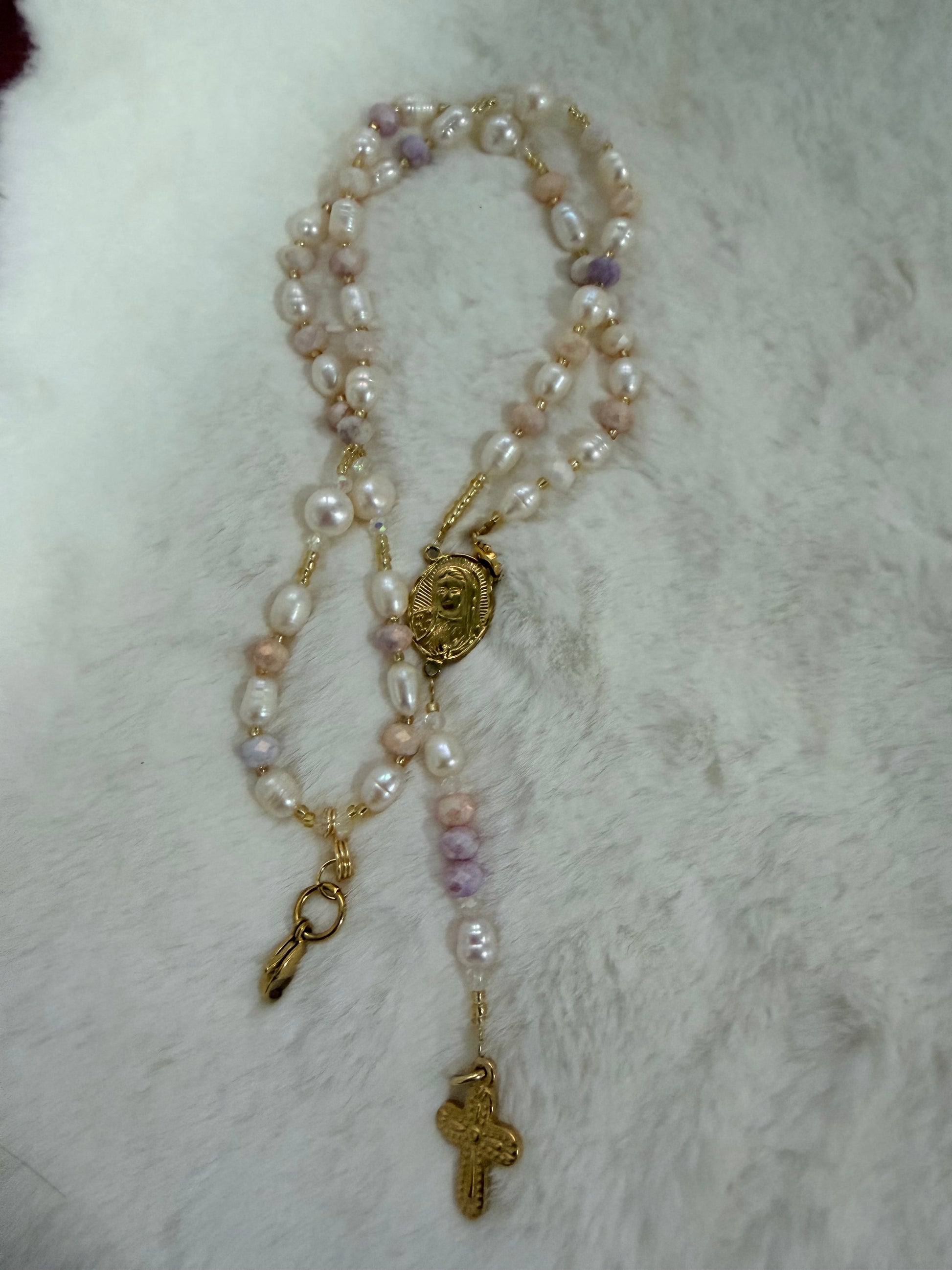 Perla Amaneceres una pieza creada para acompañarte en la fe y en lo cotidiano: un rosario pulsera elaborado con perlas alargadas y cristales checos en colores tiernos, pensado para recordarte que cada día es una oportunidad de volver a empezar.