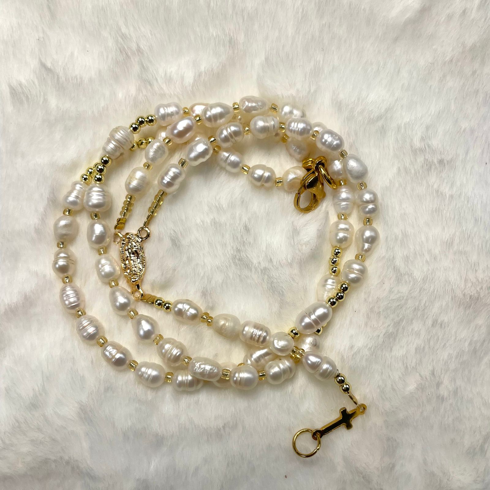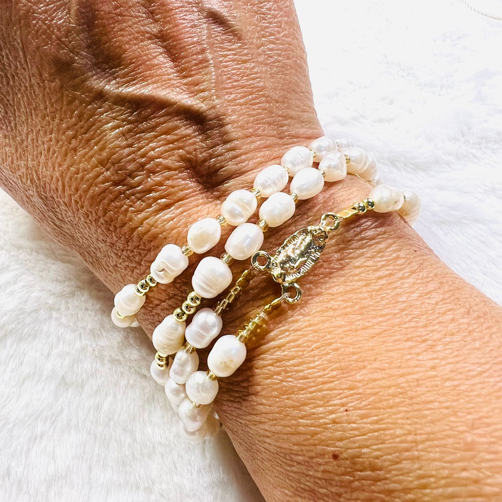 Rosario engarzado en nailon. Hecho con Perlas blancas de 6mm. Usalo como pulsera y lo mas importante para rezar.