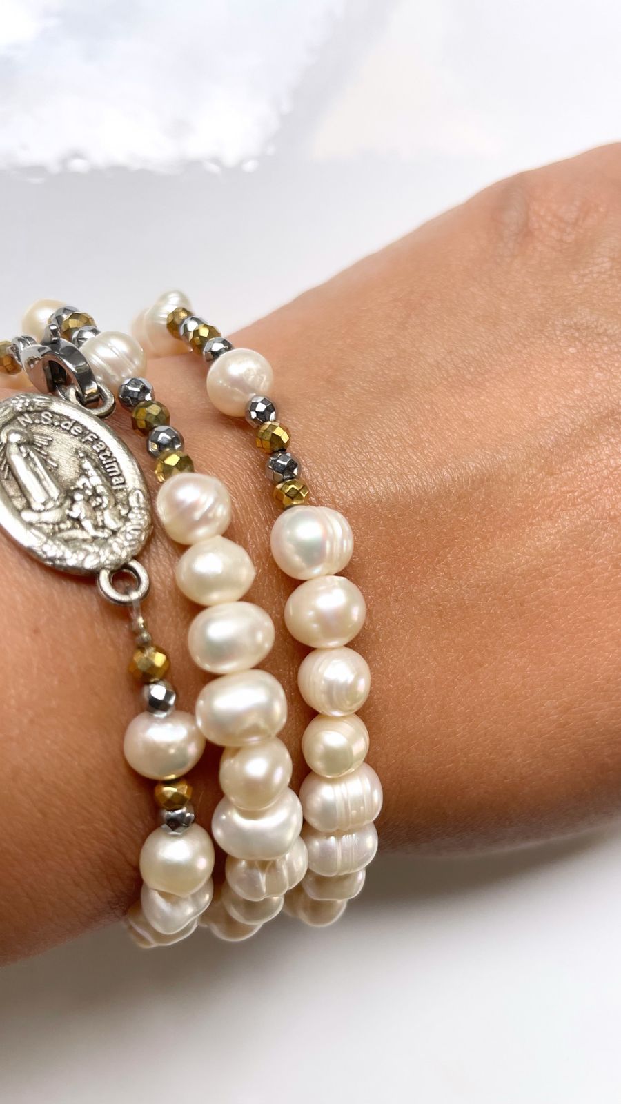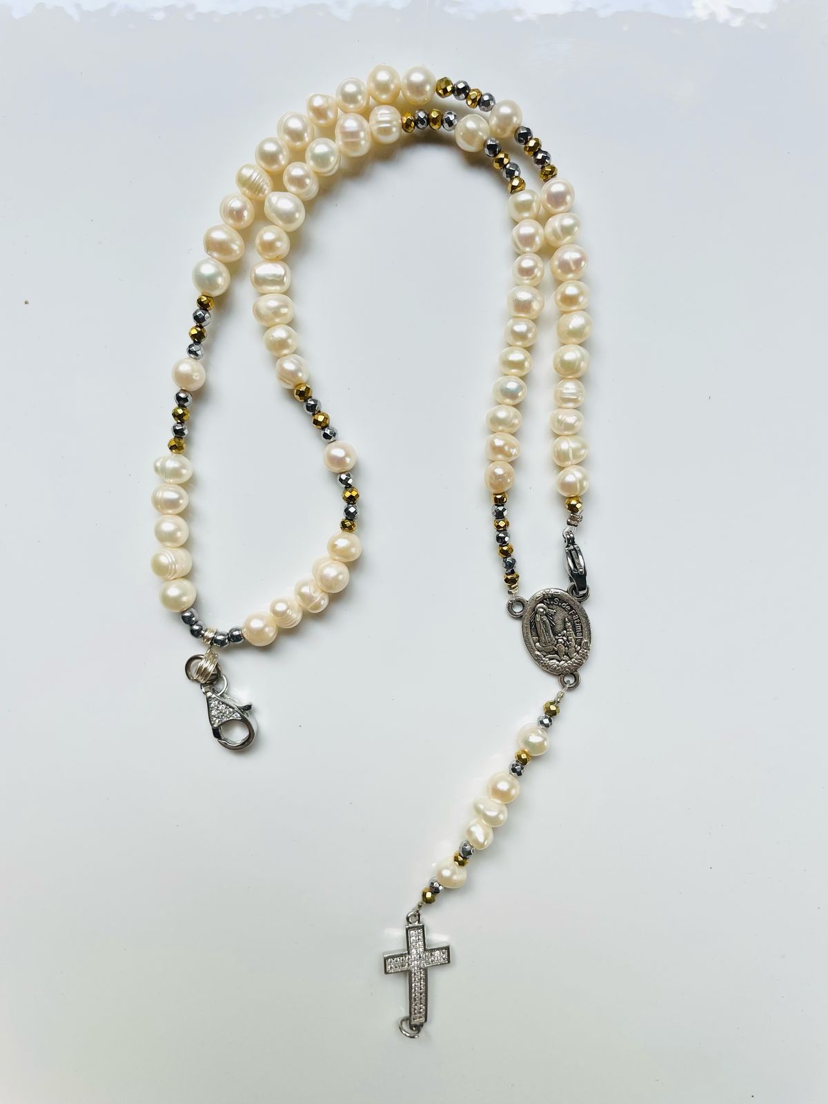 Siente la pureza y la paz en cada rezo. Este rosario ha sido creado con luminosas perlas blancas de 6mm, un símbolo de inocencia y gracia divina. Engarzado a mano en un resistente hilo de nailon, su diseño es a la vez simple y elegante.