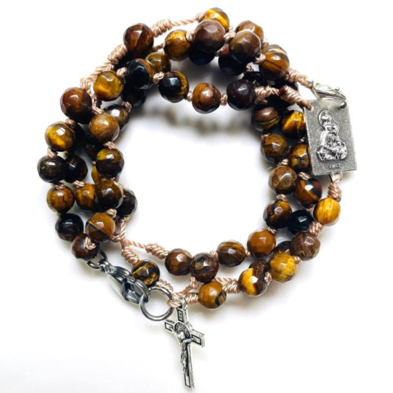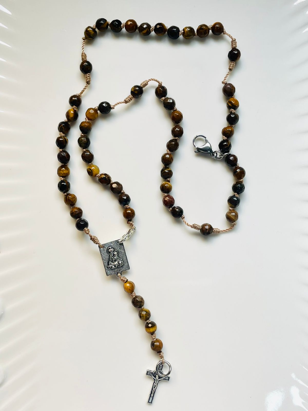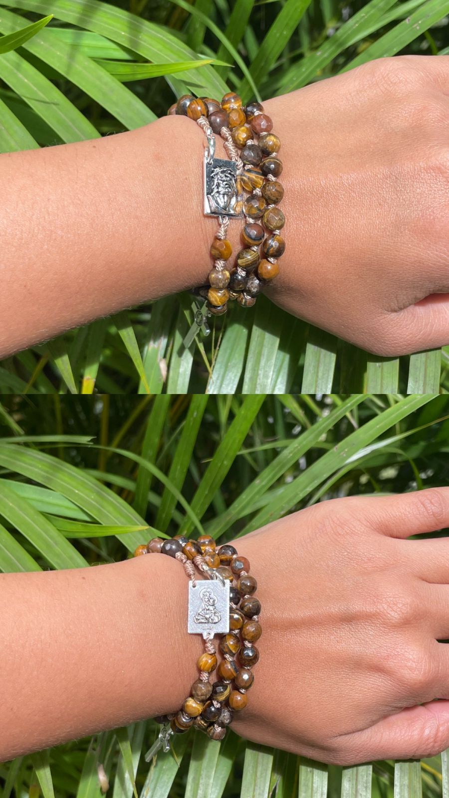 Protege tu Espíritu con el Rosario de Ojo de Tigre." Lleva la protección y la fuerza contigo. Las piedras facetadas de Ojo de Tigre de 6mm, conocidas por su poder para dar claridad y alejar las malas energías, hacen de este rosario un escudo espiritual. Su engarzado en nudo franciscano te permite usarlo como pulsera, collar o camándula, brindándote una conexión tangible con tu fe y tu fuerza interior."