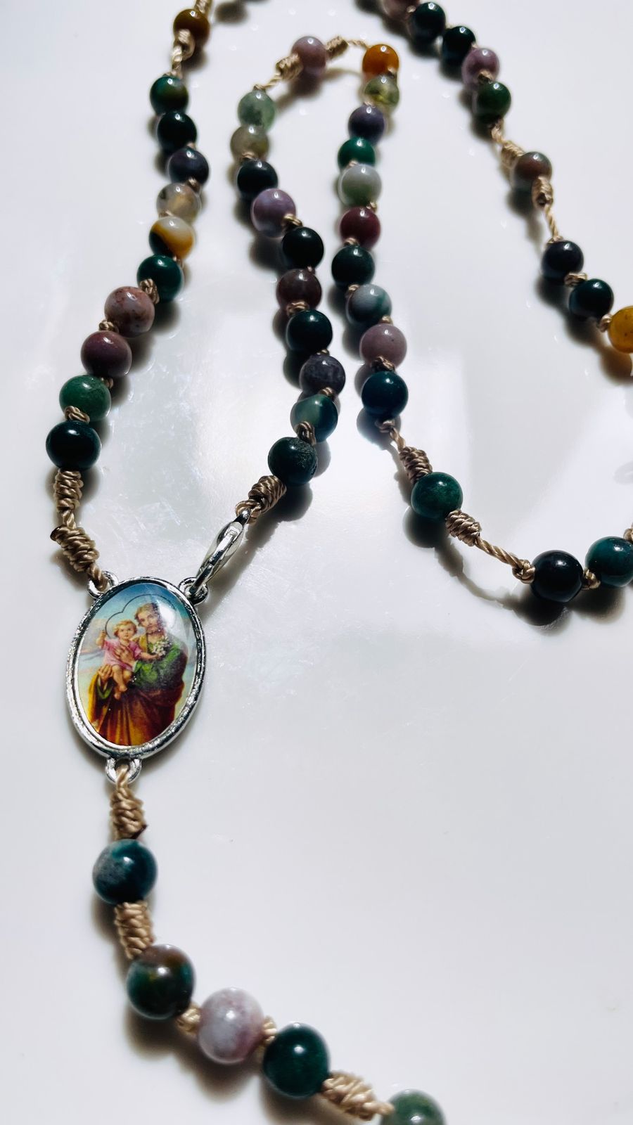 Este rosario, hecho con piedras naturales de Ágata de 6mm y accesorios platedos piuter, te ofrece una conexión única con tu fe. Puedes llevarlo como pulsera, collar o camándula. Para hacerlo aún más personal, agrega un nombre, una inicial o una palabra especial en una medalla. Personaliza tu rosario y lleva a tus seres queridos o tu intención siempre contigo.